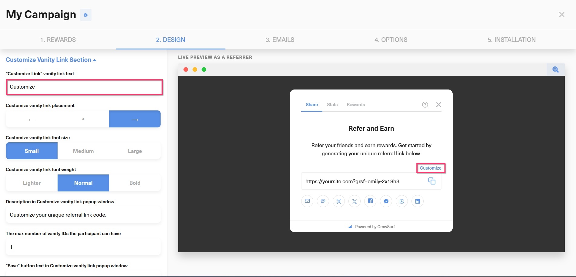 Vanity IDs can be created and customized by both GrowSurf participants and admins: